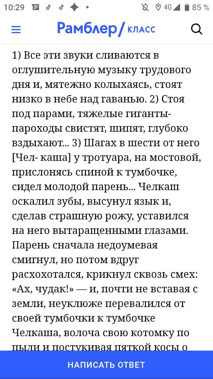 3) Шагах в шести от него [Челкаша] у тротуара, на мостовой, прислонясь спиной к тумбочке, (дееприч. оборот) сидел молодой парень... Челкаш оскалил зубы, высунул язык и, (дееприч. оборот) сделав страшную рожу, уставился на него вытаращенными глазами. Парень, (дееприч. оборот) сначала недоумевая смигнул, но потом вдруг расхохотался, крикнул сквозь смех: «Ах, чудак!» — и, (дееприч. оборот) почти не вставая с земли, неуклюже перевалился от своей тумбочки к тумбочке Челкаша, (дееприч. оборот) волоча свою котомку по пыли и постукивая пяткой косы о камни.