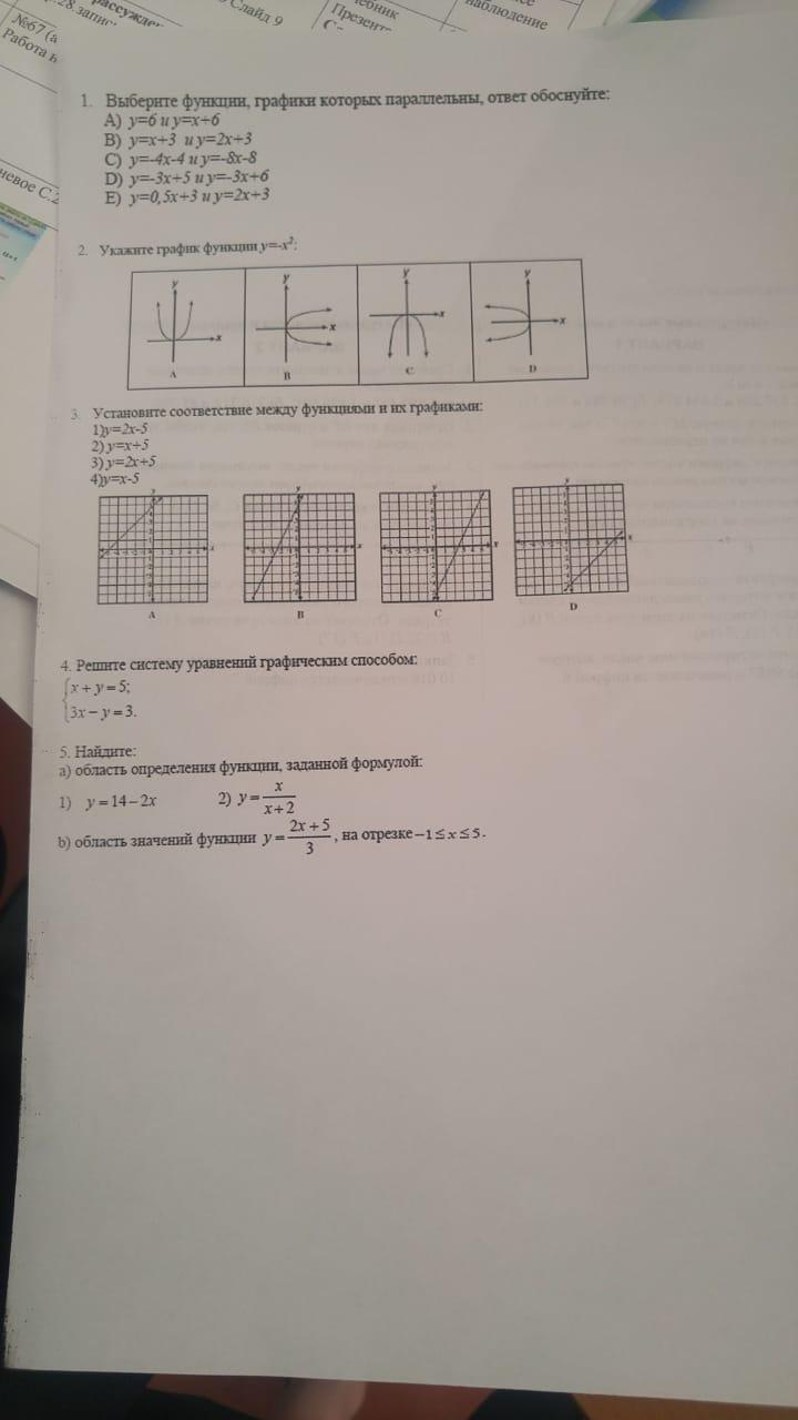 2) ответ С, т.к. ветви параболы направлены вниз ( коэффициент перед х² отрицательный) и вершина в (0,0).