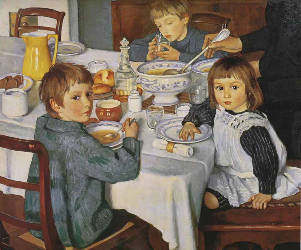 Первым делом меня привлекает правильность сервировки стола. Мы видим белую скатерть. Это говорит о том, что люди интеллигентные, опрятные, любители чтить традиции и обычаи. Сходство лиц ребят говорит о том, что это родственники. Так же можно сделать вывод о том, что дети ведут подвижный образ жизни, так как детский аппетит заметен на картине. Заметно, что ребенок, который пьет воду является старшим. Заметно, что стол богат продуктами питания. Это говорит о том, что семья вполне обеспеченная. Художник вложил в эту картину всю душу. От этой картины чувствуется тепло и забота.