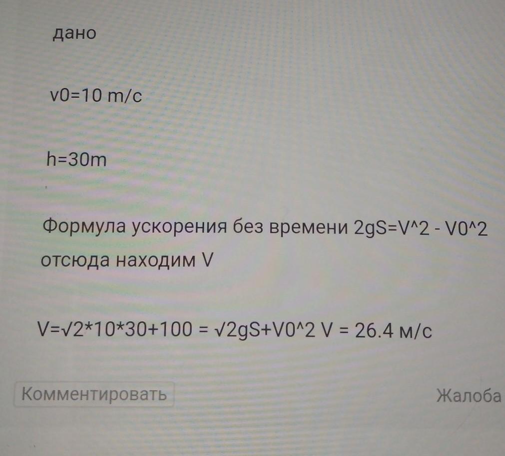 С какой скоростью упадёт за землю тело, брошено вертикально вниз со скоростью 10 м/с, с высоты 30 м. Найти скорость