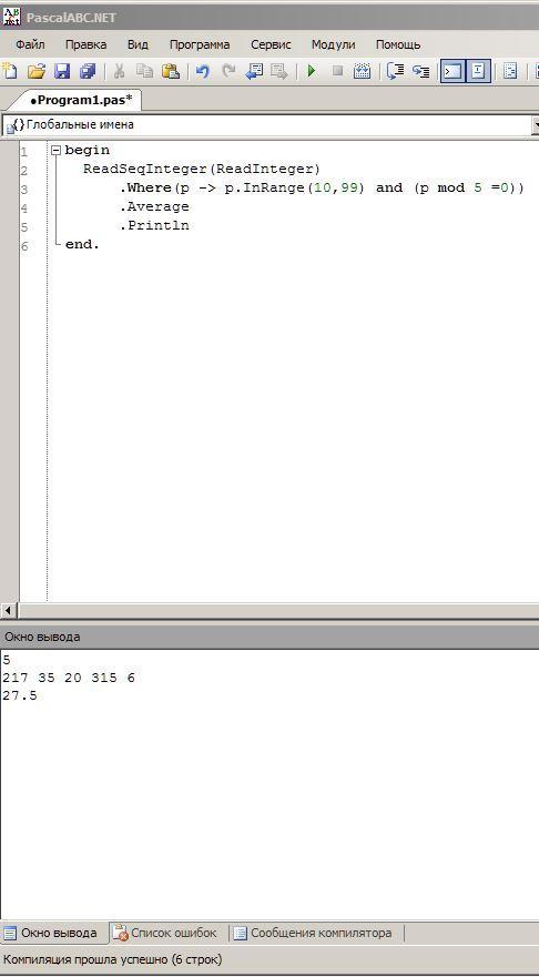 Напишите программу, которая в последовательности натуральных чисел определяет среднее арифметическое значение двухзначных чисел, кратных 5. Программа получает на вход количество чисел в последовательности, а затем сами числа. В последовательности всегда имеется число, кратное 5. Количество чисел не превышает 100. Введённые числа не превышают 300. Программа должна вывести одно число