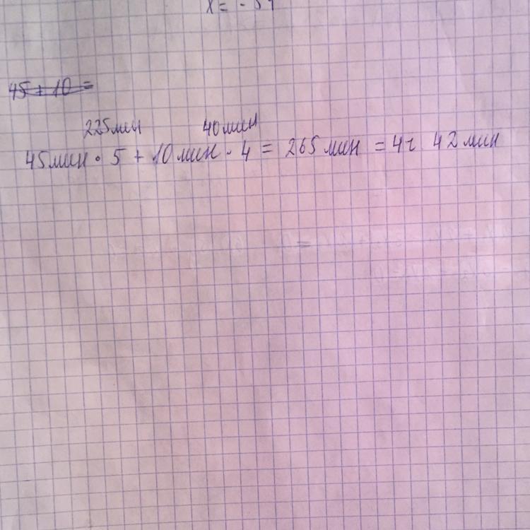У ани сегодня 5 уроков по 45 минут.Перемены между уроками длятся 10 минут.Сколько времени пройдет от звонка на первый урок до звонка с пятого урока?