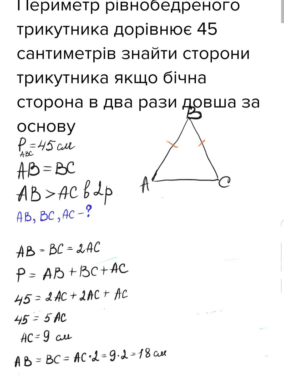 Периметр рівнобедреного трикутника дорівнює 45 сантиметрів знайти сторони трикутника якщо бічна сторона в два рази довша за основу