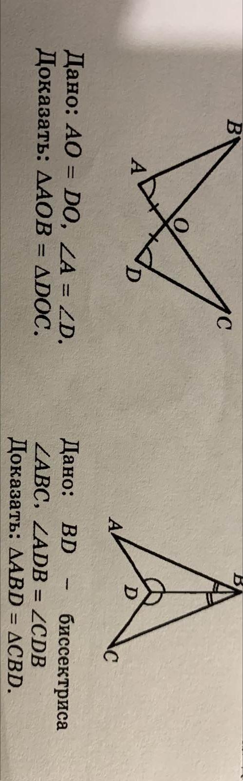 1.АО=DO усл, ∠A=∠D усл , ∠AOB=∠CODкак вертикальные, по 2 признаку равенства Δ ( сторона и два угла) Значит Δ равны.