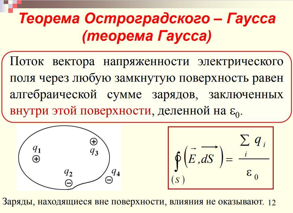 Поток вектора напряженности электрического поля через любую замкнутую поверхность равен алгебраической сумме зарядов, заключенных внутри этой поверхности, деленной на Е0 (Электрическая постоянная).