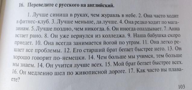 1. Better a tit in the hands than a crane in the sky. 2. She often goes to the fitness club. 3. Better less, but better. 4. She rarely goes shopping. 5. Better late than never. 6. He is sometimes late. 7. Anna gets up early. 8. He has already returned from college. 9. Our grandmother is coming soon. 10. She always does yoga in the morning. 11. She easily solves all problems. 12. His older brother runs faster than him. 13. He speaks good German. 14. The more we learn, the more we know. 14. He studies best of all. 15. My brother runs the fastest. 16. He slowly walked along a picturesque road. 17. How often do you swim?