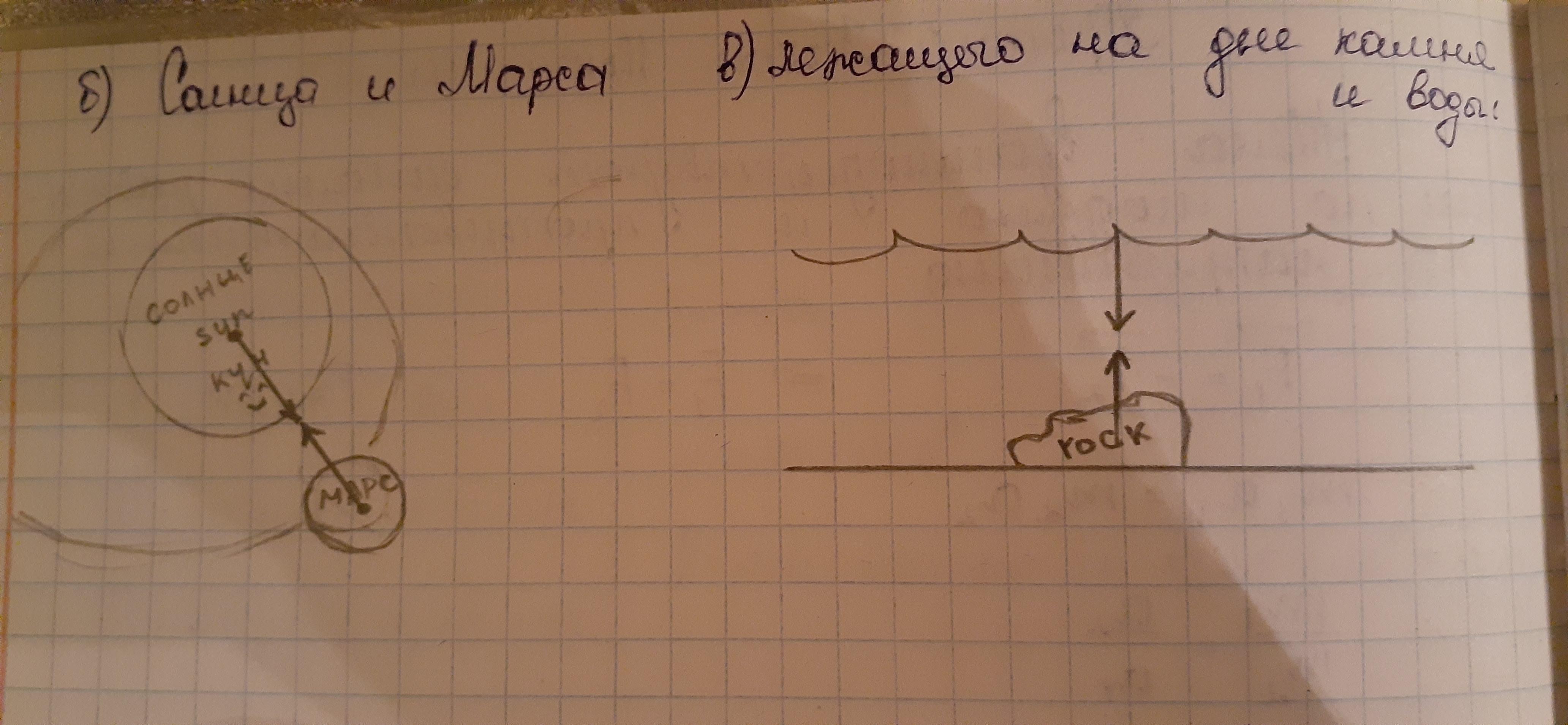 изобразите силы взаимодействия а)колеса велосипеда и поверхности дороги; б)Солнца и Марса; в)лежащего на дне реки камня и воды