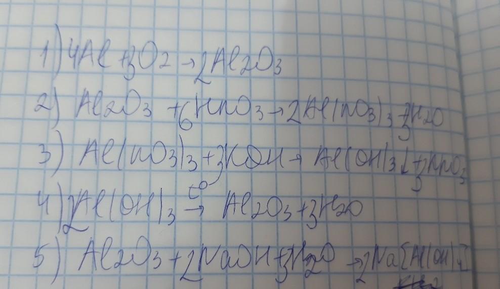 решите генетическую цепочку превращений алюминия Алюминий → оксид алюминия→ нитрат алюминия → гидроксид алюминия →оксид алюминия → алюминий→ тетрагидроксоалюминат натрия