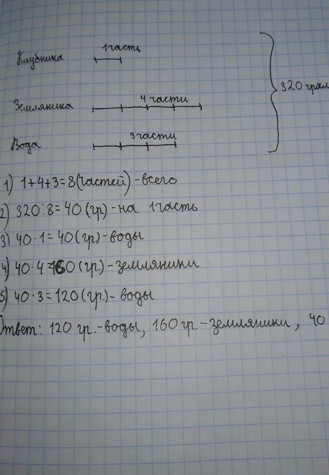 Для приготовления варенья берут 1 часть клубники , 4 части земляники и 3 части воды. Сколько граммов надо взять для приготовления 320 грамм варенья?
