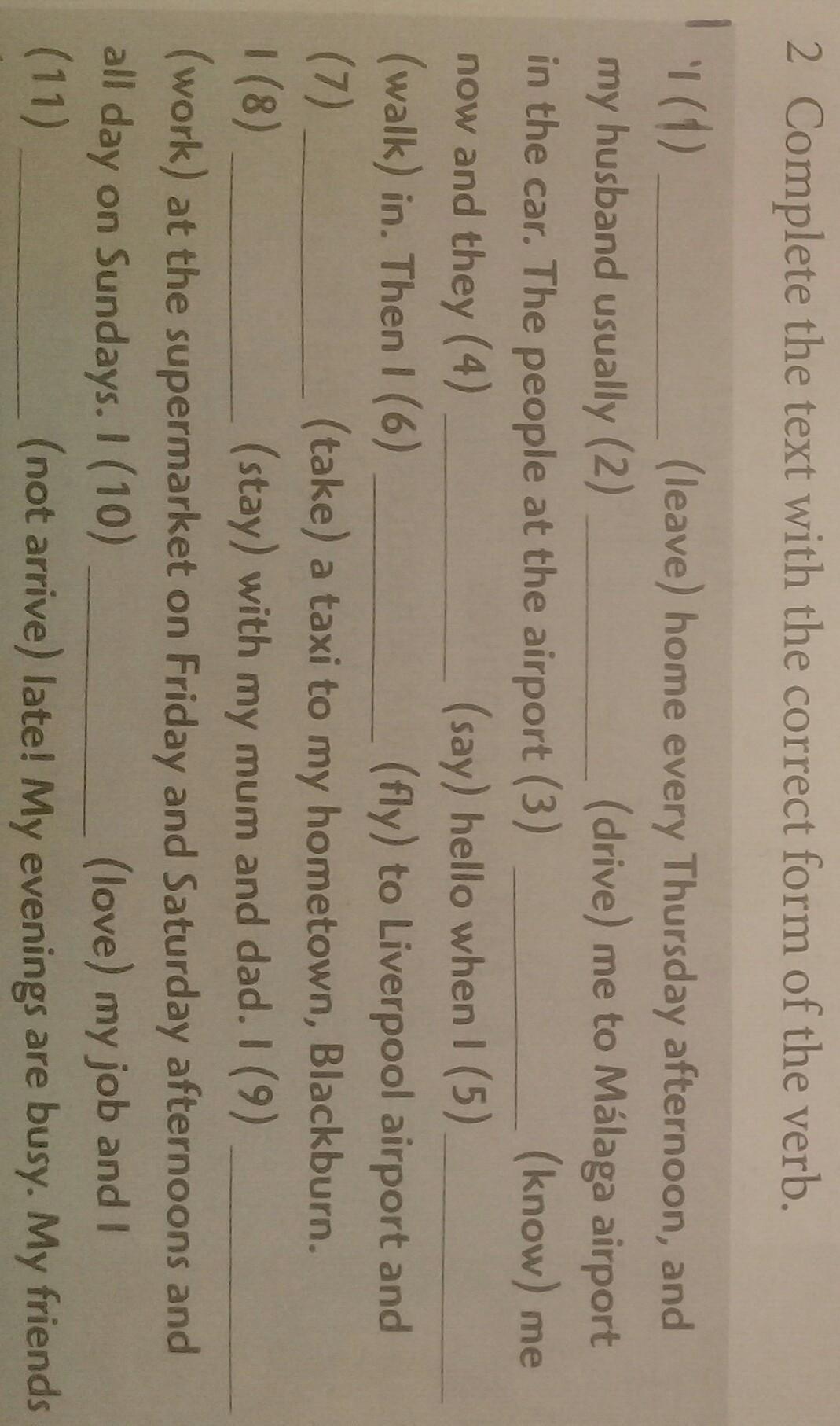 I leave home every Thursday afternoon, and my husband usually drives me to Malaga airport in the car. The people in the airport know me now and they say hello when I walk in. Then I fly to Liverpool airport and take a taxi to my hometown, Blackburn. I stay with my mum and dad. I work at the supermarket on Friday and Saturday afternoons and all day on Sundays. I love my job and I don't arrive late! My evening are busy!