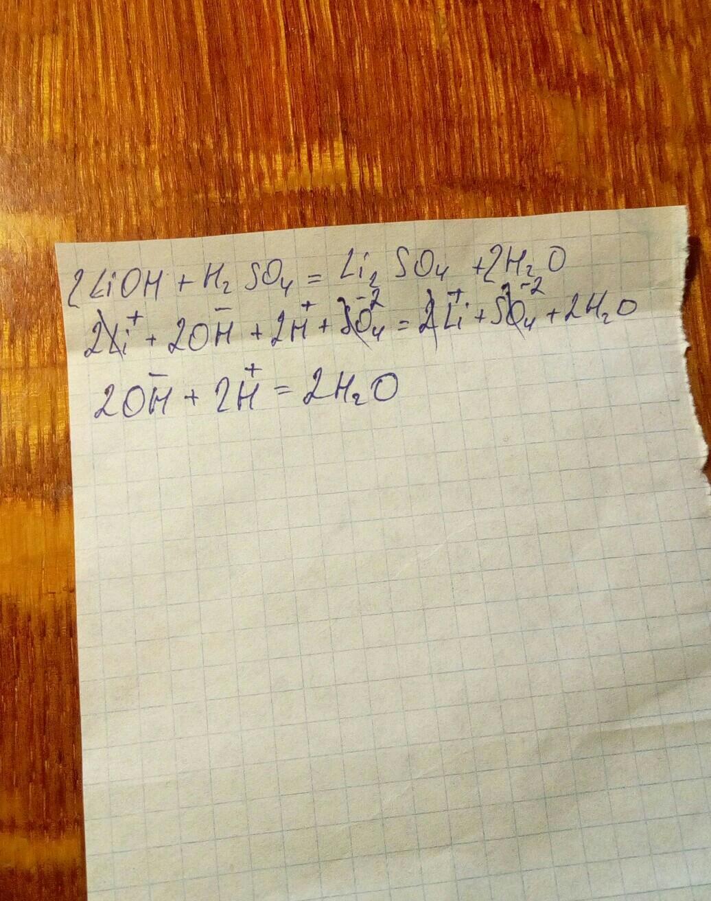 составить уравнение реакции ионного обмена в молекулярной, полной ионной и сокращенной ионной формах LiOH+H2SO4=Li2SO4+H2O