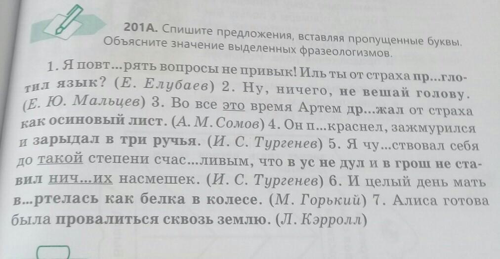 1.я повторять вопросы не привык! иль ты от страха проглотил язык?(проглотить язык - молчать).2.Ну, ничего, не вешай голову(вешать голову - приходить в уныние, отчаиваться).3.Во всё это время Артём дрожал от страха как осиновый лист(дрожать как осиновый лист - сильно бояться).4. Он покраснел, зажмурился и зарыдал в три ручья(рыдать в три ручья - плакать много, долго, проливая большое количество слёз).5.Я чувствовал себя до такой степени счастливым, что в ус не дул и в грош не ставил ничьих насмешек.(в ус не дуть - не испытывать беспокойства, в грош не ставить - не придавать никакого значения чему-либо).6.И целый день мать вертелась как белка в колесе(вертеться как белка в колесе - быть в постоянных заботах).7.Алиса готова была провалиться сквозь землю(провалиться сквозь землю - скрыться где-нибудь от стыда)