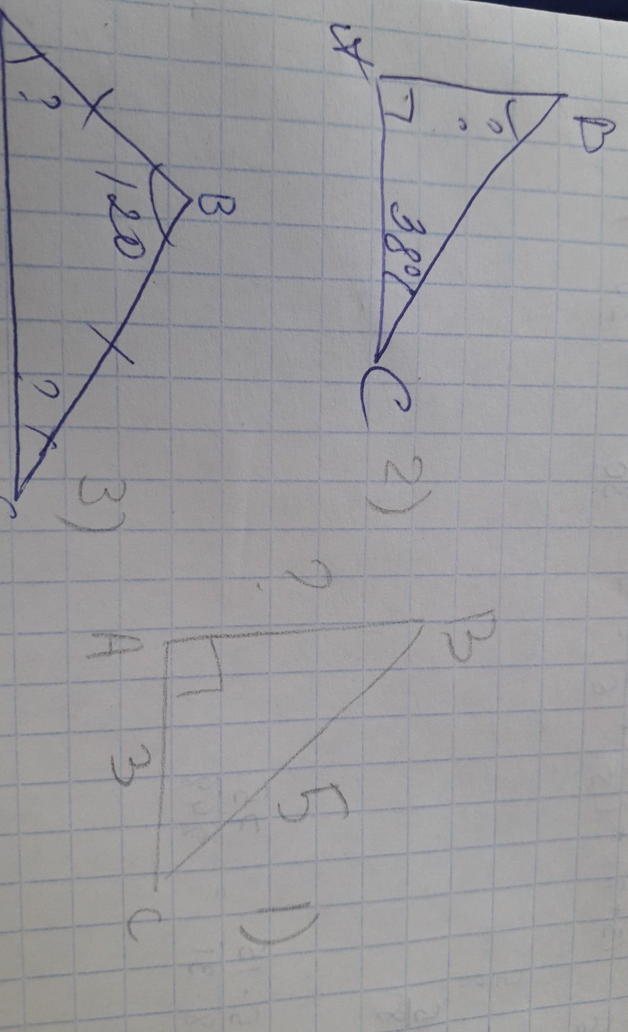 2) равнобедренный треугольник. Есть правило что у равнобедренного треугольника углы при основании равны . Поэтому от 180 нужно отнять 120 получится 60. И 60 разделить пополам проучится по 30 градусов на нижние углы)