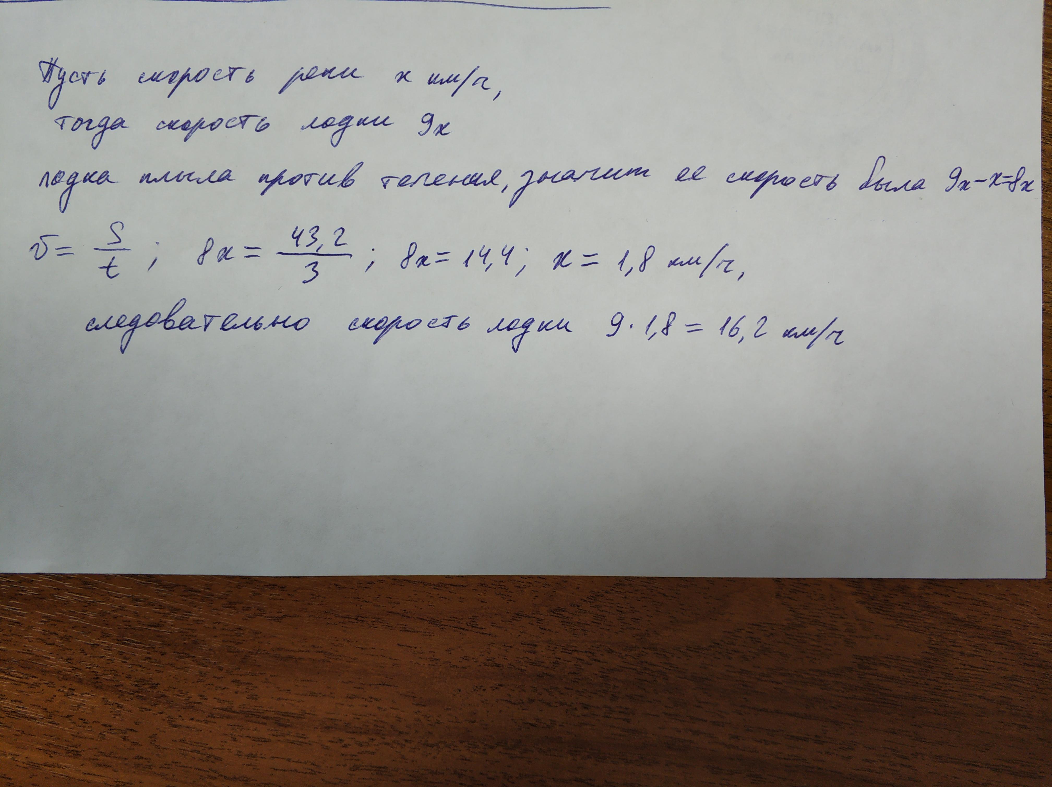 Отношение скорости самой моторной лодки к скорости течения реки 9:1 . Найдите скорость самой моторной лодки и скорость течения реки , если моторная лодка проплывает за 3 часа против течения реки 43,2 км .