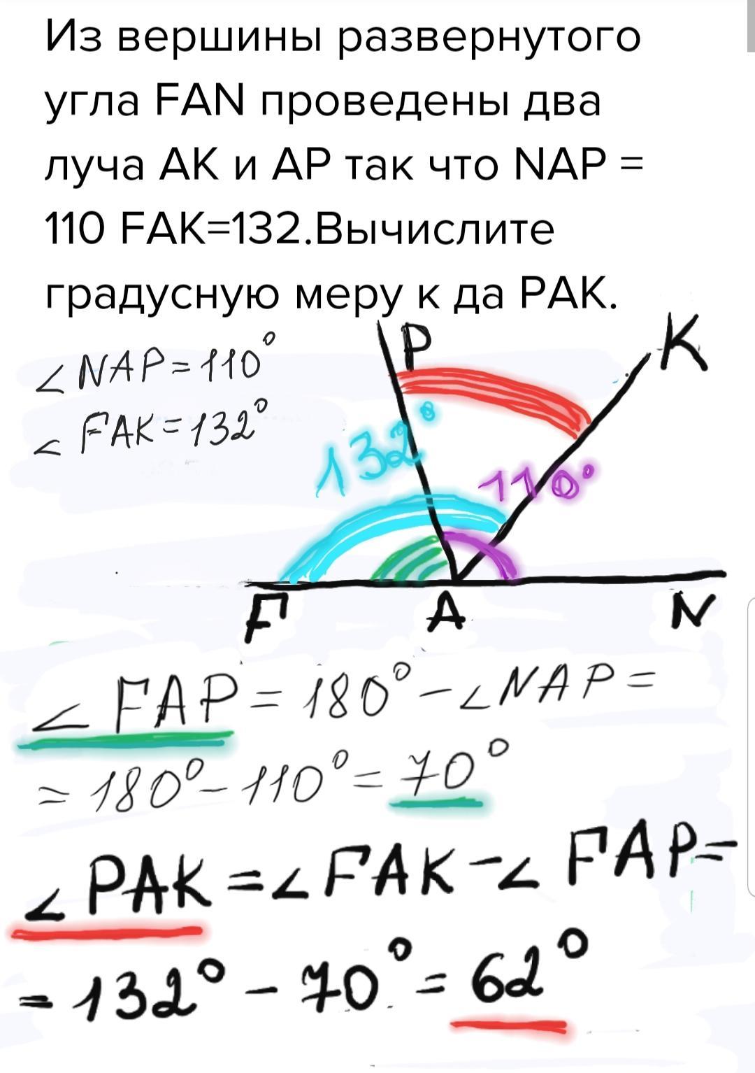 Из вершины развернутого угла FAN проведены два луча АК и АР так что NАР = 110 FAK=132.Вычислите градусную меру к да РАК.