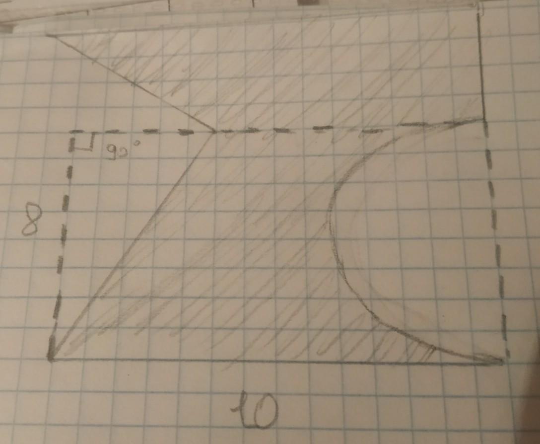 В прямоугольнике есть две незакрашенные фигуры - полукруг и прямоугольный треугольник. Сначала найдём площадь полукруга: