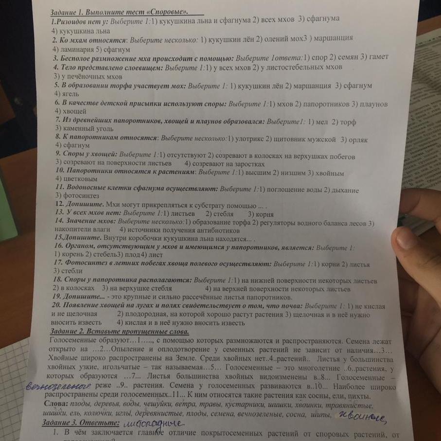 Ответ: 1- нет верного ответа, 2-1235, 3-1, 4-3,5-3,6-3,8-23,9-2,10-1,11-1,12- ризоидов, 13-3, 14-123,15-споры, 16-1,17-3,18-1, 19-вайи