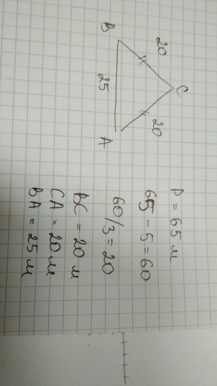 Дано: ΔCBA,CB=AC. Основание треугольника на 5 м больше боковой стороны. Периметр треугольника CBA равен 65 м. Вычисли стороны треугольника.