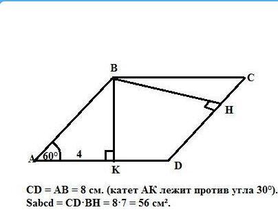В прямоугольном треугольнике АВК ∠А = 60° (дано), гипотенуза АВ = 8 см, так как катет АК лежит против угла 30° (по сумме острых углов прямоугольного треугольника).