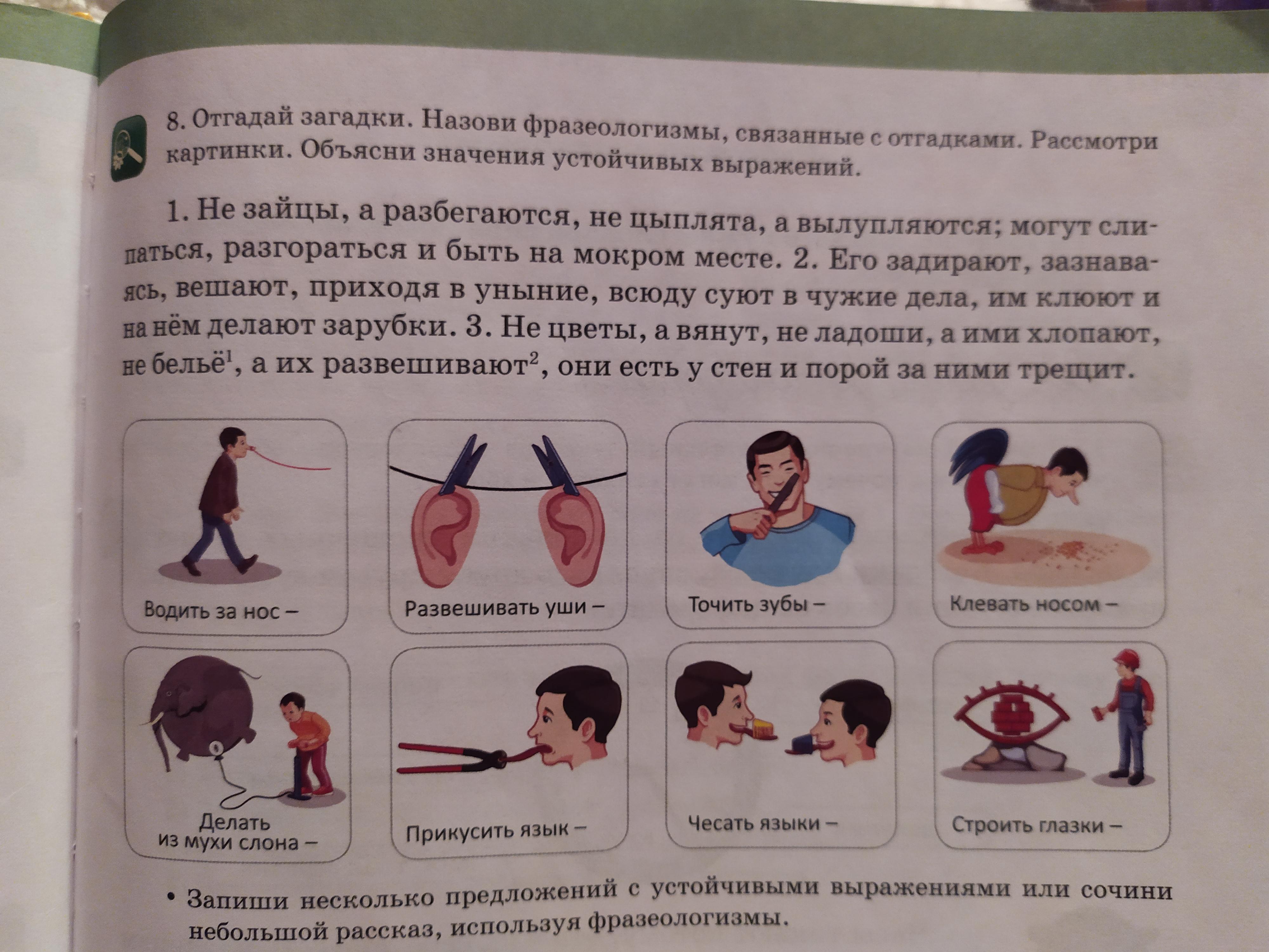 Отгадай загадки. Назови фразеологизмы, связанные с отгадками. Рассмотрим картинки. Обьясни значения устойчивых выражений.