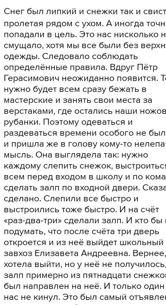 Снег был липкий и снежки так и свистели, пролетая рядом с ухом. А иногда точно попадали в цель. Это нас нисколько не смущало, хотя мы все были без верхней одежды. Следовало соблюдать определённые правила. Вдруг Пётр Герасимович неожиданно появится. Тогда нужно будет всем сразу бежать в мастерские и занять свои места за верстаками, где остались наши ножовки и рубанки. Поэтому одеваться и раздеваться времени особого не было. Ну и пришла же в голову кому-то нелепая мысль. Она выглядела так: нужно каждому слепить снежок, выстроиться всем перед входом в школу и по команде сделать залп по входной двери. Сказано – сделано. Слепили все быстро и выстроились тоже быстро. И на счёт «раз-два-три» сделали залп. И кто бы мог подумать, что после счёта три дверь откроется и из неё выйдет школьный завхоз Елизавета Андреевна. Вернее, она хотела выйти, но у неё не получилось, так залп примерно из пятнадцати снежков был направлен на неё. И только один из нас не кинул. Это был самый отъявленный хулиган класса, Олег, которого все называли почему-то Рыба. То ли шестое чувство подсказало что-то, то ли не успел. Но факт в том, что мы все бросились бежать, а он остался. Елизавета Андреевна, когда попала под залп, то закрыла глаза и нас всех не узнала. А когда их открыла, то увидела только одного Олега, который показывал ей свой снежок в руке и громко кричал, что он не кидал, кидали другие. А у него вот доказательство, снежок, который он так и не кинул. Странно, но никто ему не поверил. Ни Елизавета Андреевна, ни директор школы. Интересно, почему? Он ведь и правда не кинул