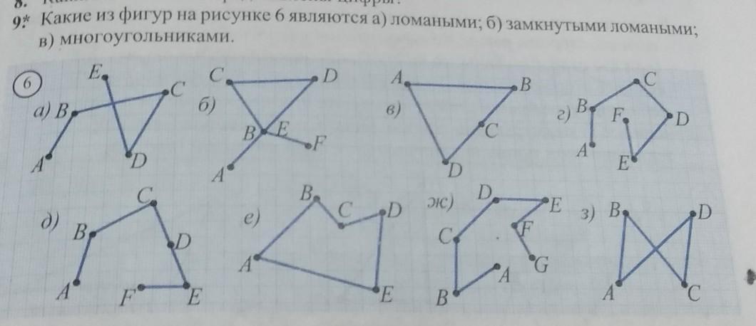 а) замкнутый ломаный б) замкнутый ломаный в) многоугольник г) ломанный д) ломанный е) многоугольник ж) ломанный з) замкнутый ломанный