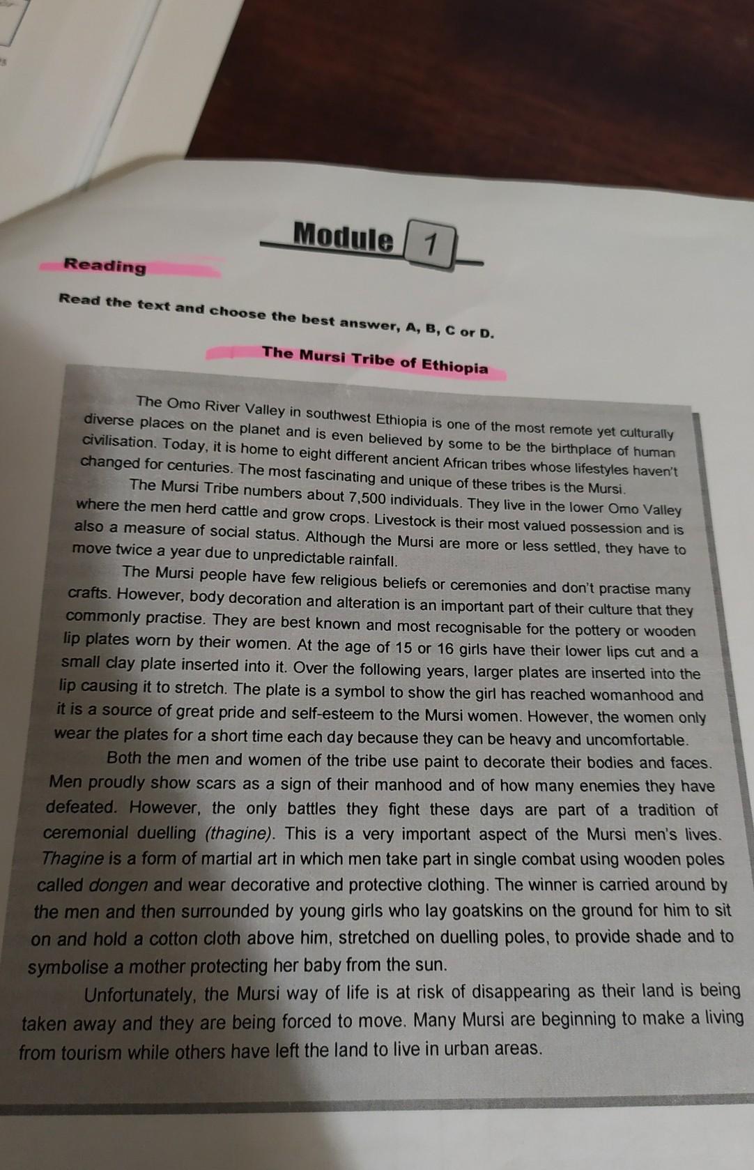 Долина реки Омо на юго-западе Эфиопии является одним из самых отдаленных, но в то же время изрезанных местами на планете, и когда-то считалось, что она является местом рождения человеческой цивилизации. Сегодня здесь проживают восемь различных древних африканских племен, чей образ жизни не изменился за столетия. Самым захватывающим и уникальным из этих племен является племя мурси. В племени мурси насчитывается около 7500 особей. Они живут в нижней долине реки Омо, где пасут скот и выращивают сгопс. Домашний скот является их наиболее ценной целью, а также мерой социального статуса. Хотя Мурси более или менее заселены, они вынуждены двигаться два раза в год из-за необратимых осадков. Люди Мурси имеют мало религиозных верований или церемоний и не практикуют различные виды рукоделия. Тем не менее, разделение тела и изменение тела является важной частью их культуры, которую они обычно практикуют. Они являются самыми известными и наиболее узнаваемыми из-за керамических или деревянных губных тарелок, которые носят их женщины. В возрасте 15-16 лет у девочек обрезают нижнюю губу и вставляют в нее маленькую глиняную тарелку. В последующие годы в ir вставляют большие пластины, заставляя их растягиваться. Тарелка является символом, показывающим, что мужская одежда достигла женственности, и является источником большой гордости и самоуважения для женщин Мурси. Однако женщины носят пластины только на короткое время каждый день, потому что они могут быть тяжелыми и неудобными. И мужчины, и женщины племени используют краску для украшения своих тел и лиц. Мужчины гордо показывают шрамы в знак своей мужественности и того, сколько врагов они победили. Тем не менее, единственные битвы, в которых они сражаются в эти дни, являются частью традиции церемониальных дуэлей (тагин). Это очень важный аспект жизни мужчин Мурси. Thagine - это вид боевого искусства, в котором мужчины принимают участие в единоборстве, используя деревянные шесты, называемые донген, и носят декоративную и защитную одежду. Победителя несут мужчины, а затем его окружают молодые девушки, которые кладут на землю козлиные шкуры, чтобы он мог сидеть и держать над собой хлопчатобумажную ткань, натянутую на дуэли, чтобы обеспечить тень и символизировать мать, защищающую своего ребенка от солнце. К сожалению, образ жизни Мурси рискует исчезнуть, так как их земли отбирают, и они вынуждены двигаться. Многие Мурси начинают зарабатывать на жизнь туризмом, в то время как другие покидают землю, чтобы жить в городских районах.