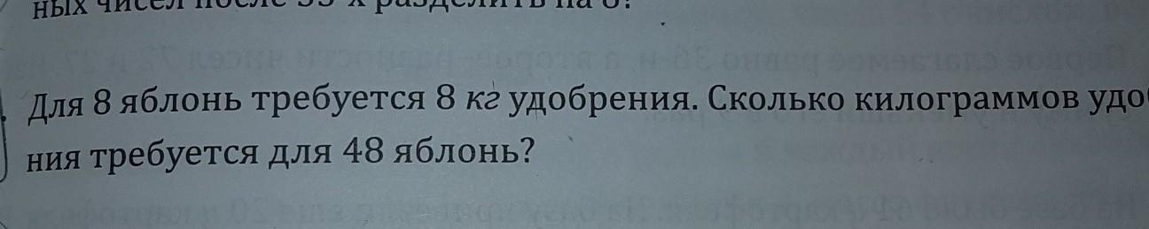 Пошаговое объяснение: для 8 яблонь требуется 8 кг удобрения значит на каждое дерево потребуется 1 кг удобрения.