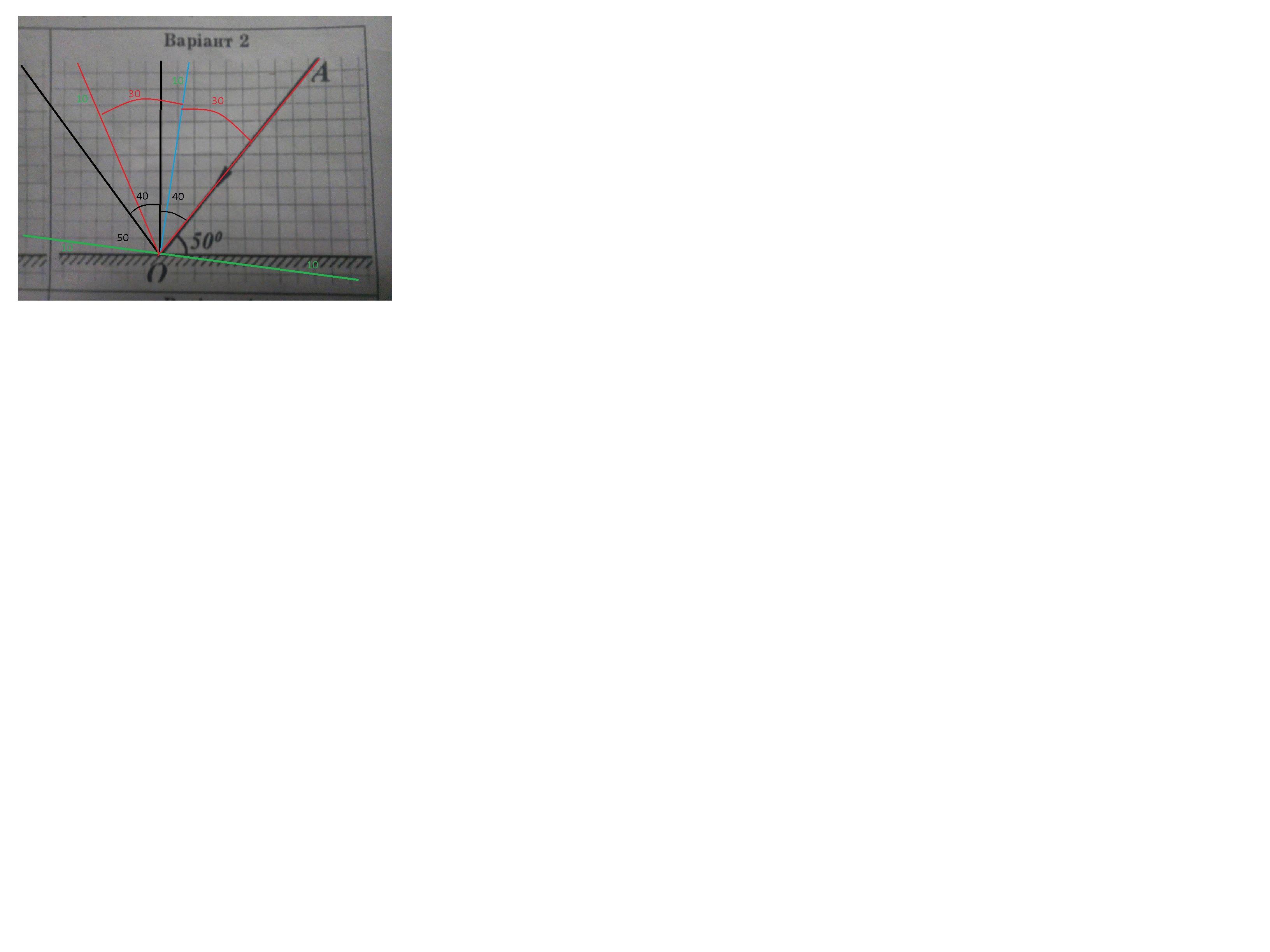 Чему будет равен угол между падающим лучом AO и отраженным лучом OB, если зеркало повернуть на 10 ° за часовой стрелкой. Кут падения 50°. Об'ясните
