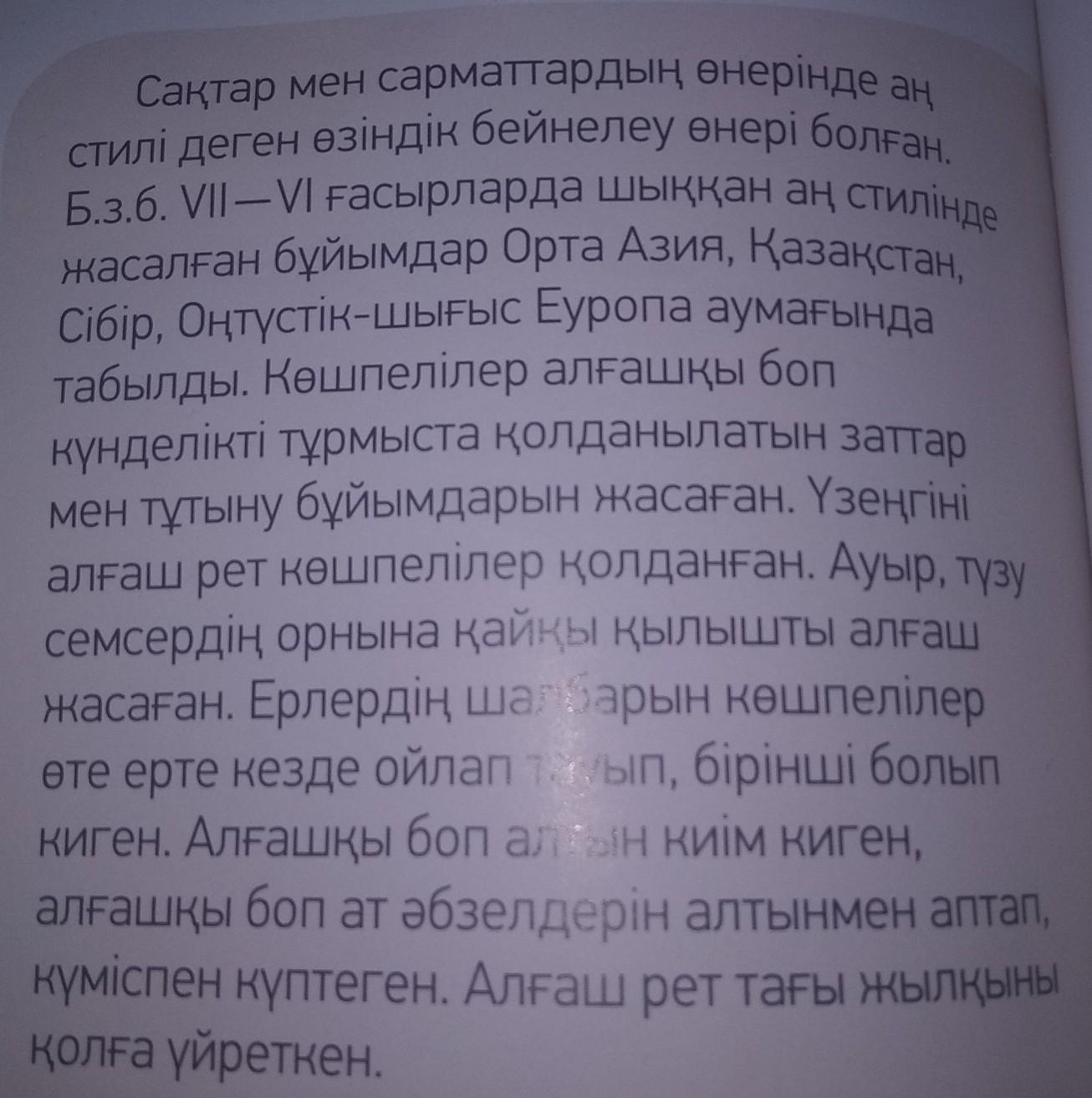 Ответ: Оларда аң стильіндегі бейнелеу өнері болған.