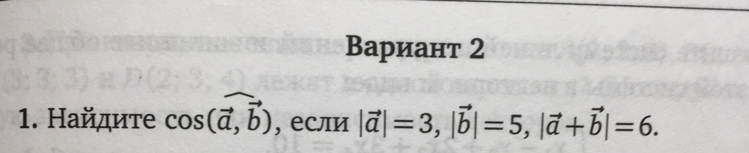 Задача. Найдите косинус угла между векторами a и b, если |a| = 3, |b| = 5, |a+b| = 6