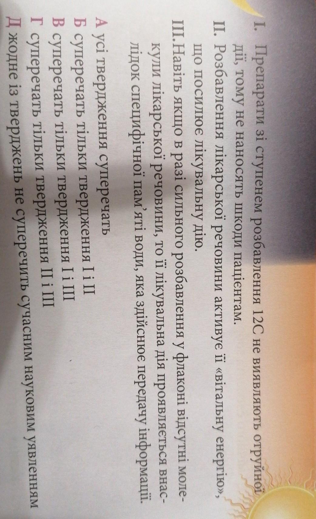 17. В альтернативній медицині є напрям лікування із недоведеною ефективністю обгрунтовують висловом відомого лікаря й алхіміка Середньовіч- чя Парацельса: «Усе чає доза». Узявши за гасло цей вислів, гомеопати виготовляють гомеопатія. Свій підхід до лікування гомеопати отрута й усе-ліки. I те, і друге визна- ліки з різних отрут, дуже сильно розбавляючи їх водою. Так, один 13 поширених ступенів розбавлення позначають 12С, який озна- чае, що 12 разів поспіль необхідно розбавити розчин у 100 разів. За такого розбавлення 1 л гомеопатичного розчину може містити одну-дві молекули лікарської речовини (отрути). Однак навіть за більшого розбавлення, за якого в певному флаконі молекули лікарської речовини відсутні, гомеопати знаходять переконливі докази користі гомеопатичних препаратів. Позначте твердження щодо гомеопатії, які суперечать сучасним науковим уявленням.