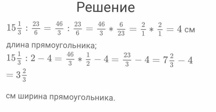 1) 15 1/3 : 23/6 = 46/3 * 6/23 = 46*6 : 3*23 = 2*2/1 = 4 (сантиметра) - длина прямоугольника