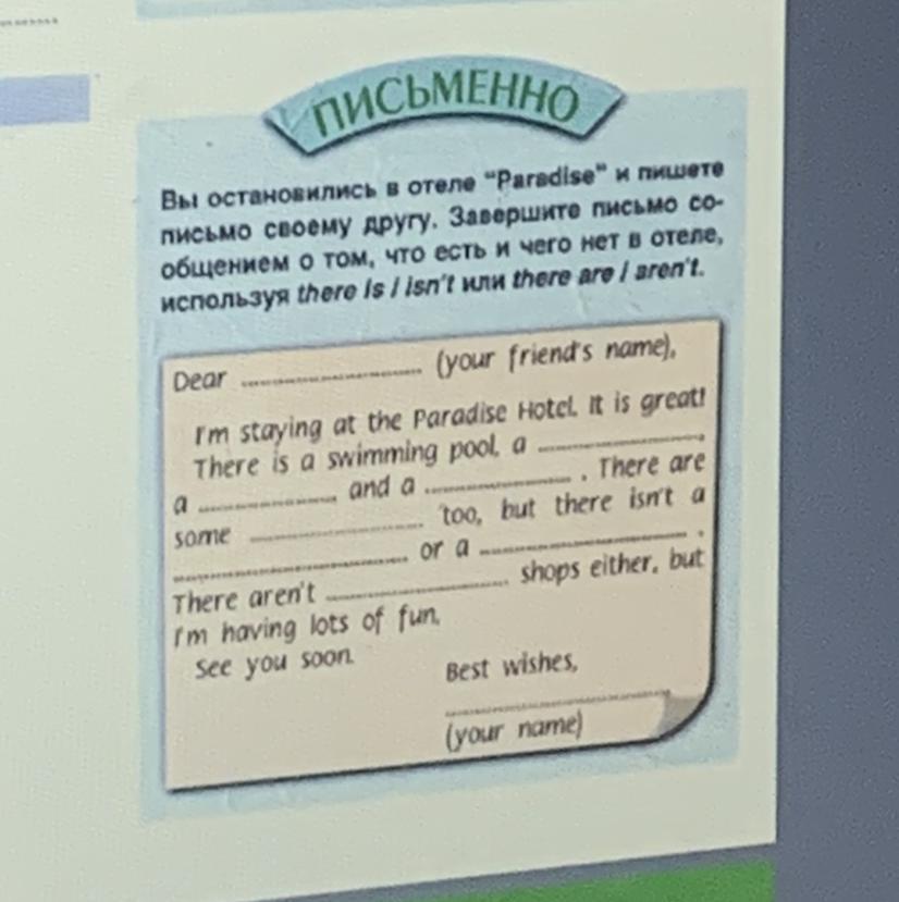 a the gym,a restaurant and a spa.There are some cafes too,but there isn’t a indoor pool or a library.There aren’t clothing shops either (своё имя)