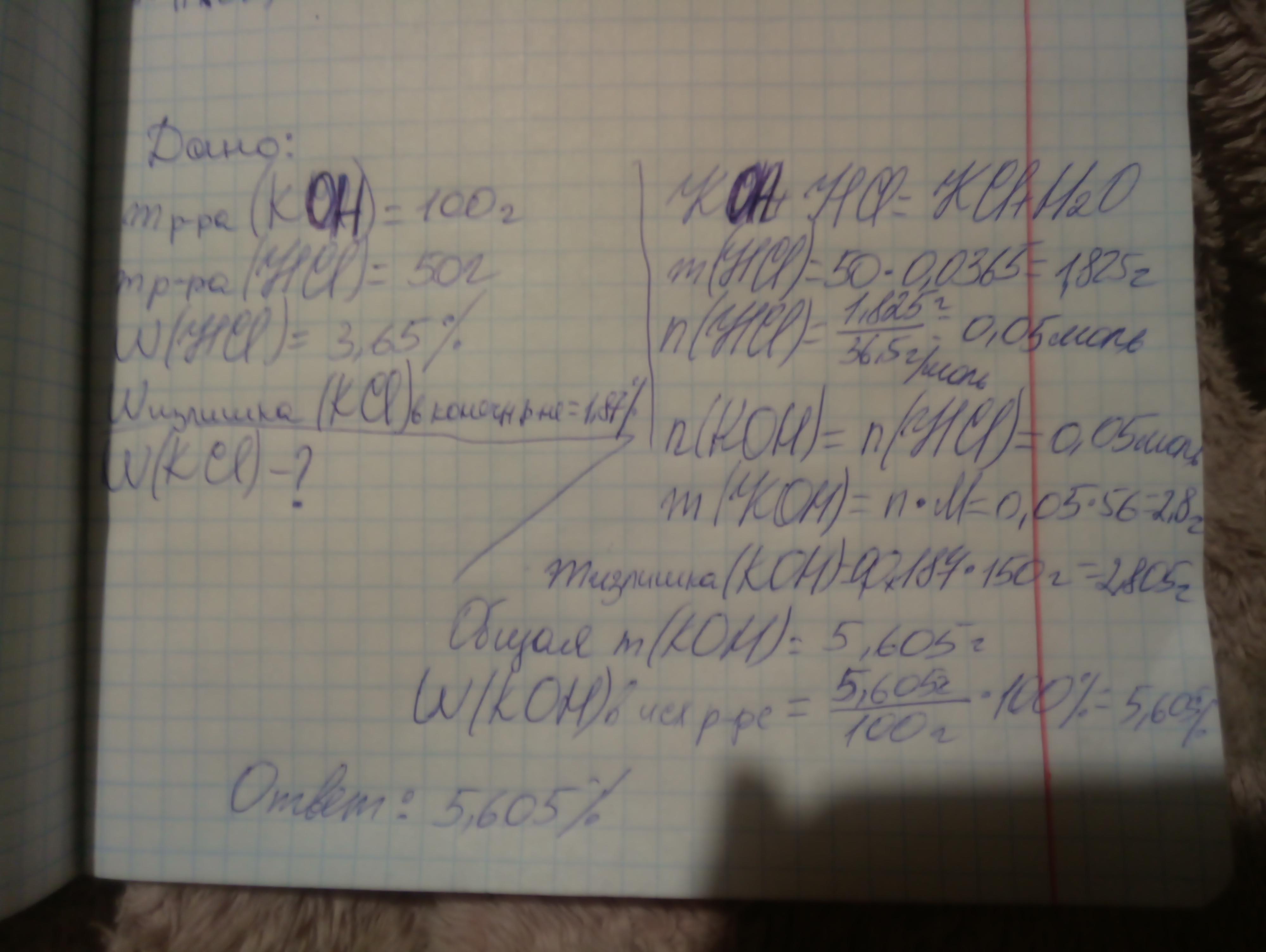 К раствору гидроксида калия массой 100 г добавили раствор хлороводородной кислоты массой 50 г с массовой долей HCL, равно 3,65%. Определите массовую долю гидроксида калия в исходном растворе, если в конечном растворе она равна 1.87%