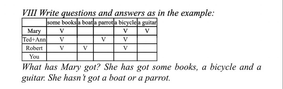 2) What has Robert got? He has got some books, a boat and a bicycle. He hasn’t got a parrot or a guitar.
