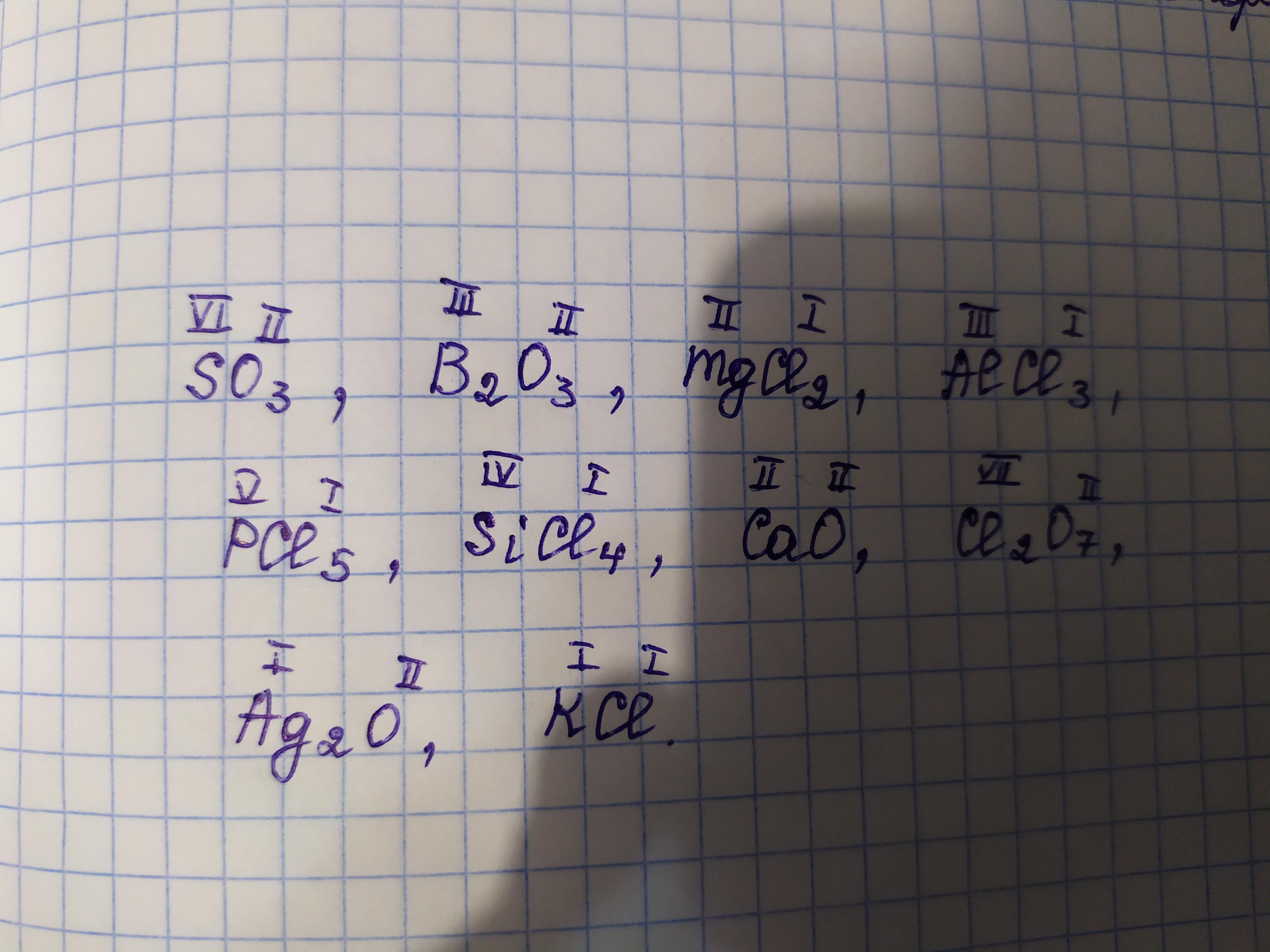 Определите валентность элементов,зная валентность кислорода и хлора: so3, b2o3, MgCl2, AlCl3, PCl5, SiCl4, CaO, Cl2O7, Ag2O, KCl.