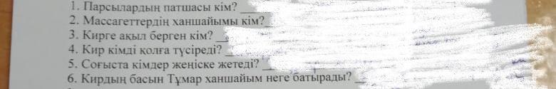 6 сурак Кирдің басын Томирис ханшайым қан толы торсыққа батырады.