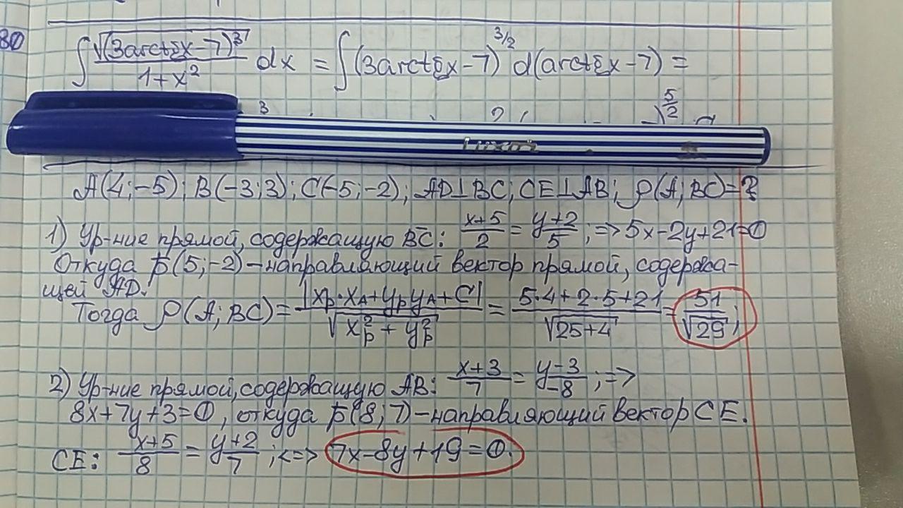 Найти длину высоты AD в треугольнике с вершинами A (4,-5), B(-3, 3), C( -5, -2) и написать уравнение перпендикуляра, опущенного из точки C на прямую AB.