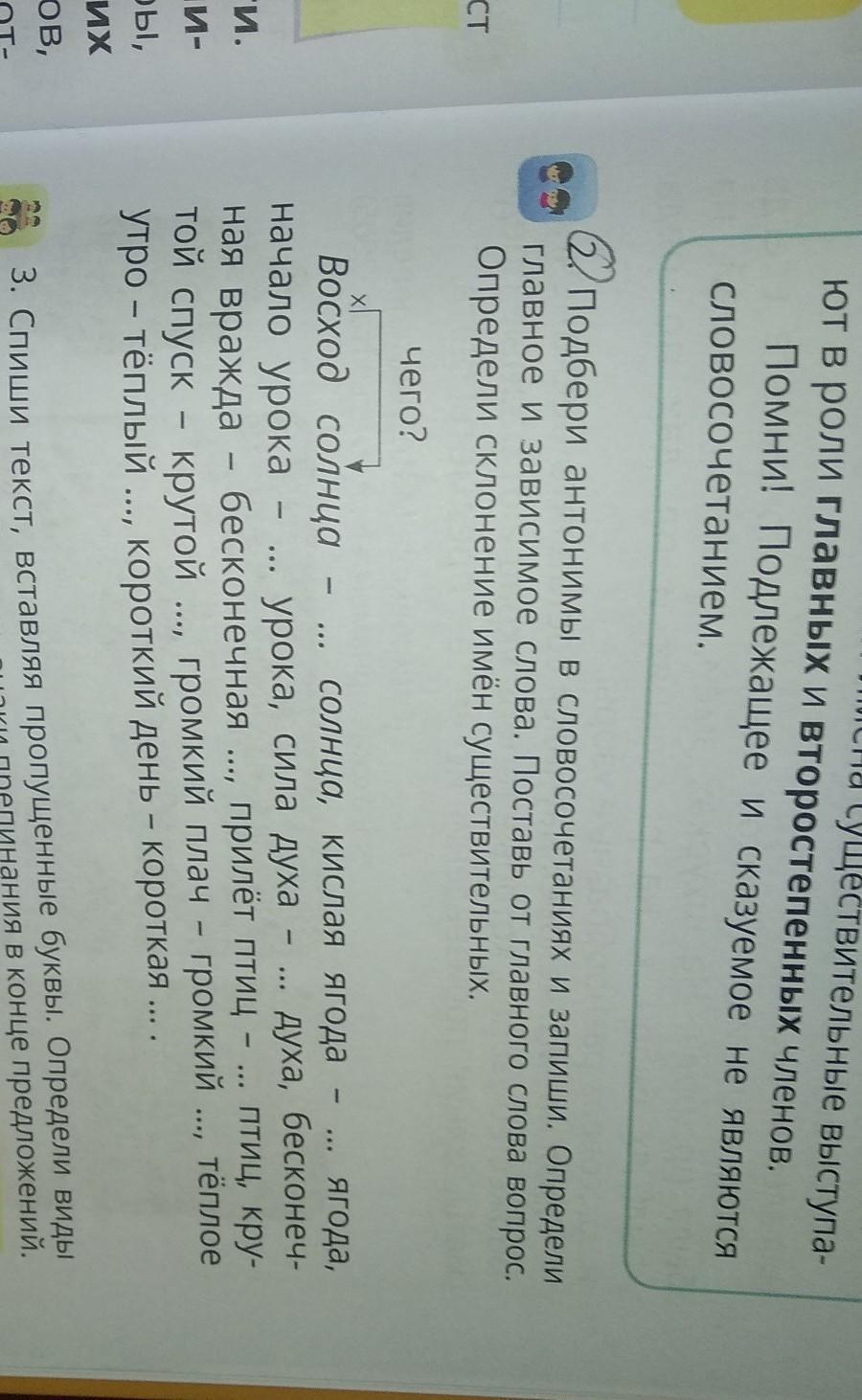 подбери антонимы в слово сочитаниях и запиши определи главное и зависимое слова поставь от главного слова вопрос опредили склонение имён существительных восход солнца