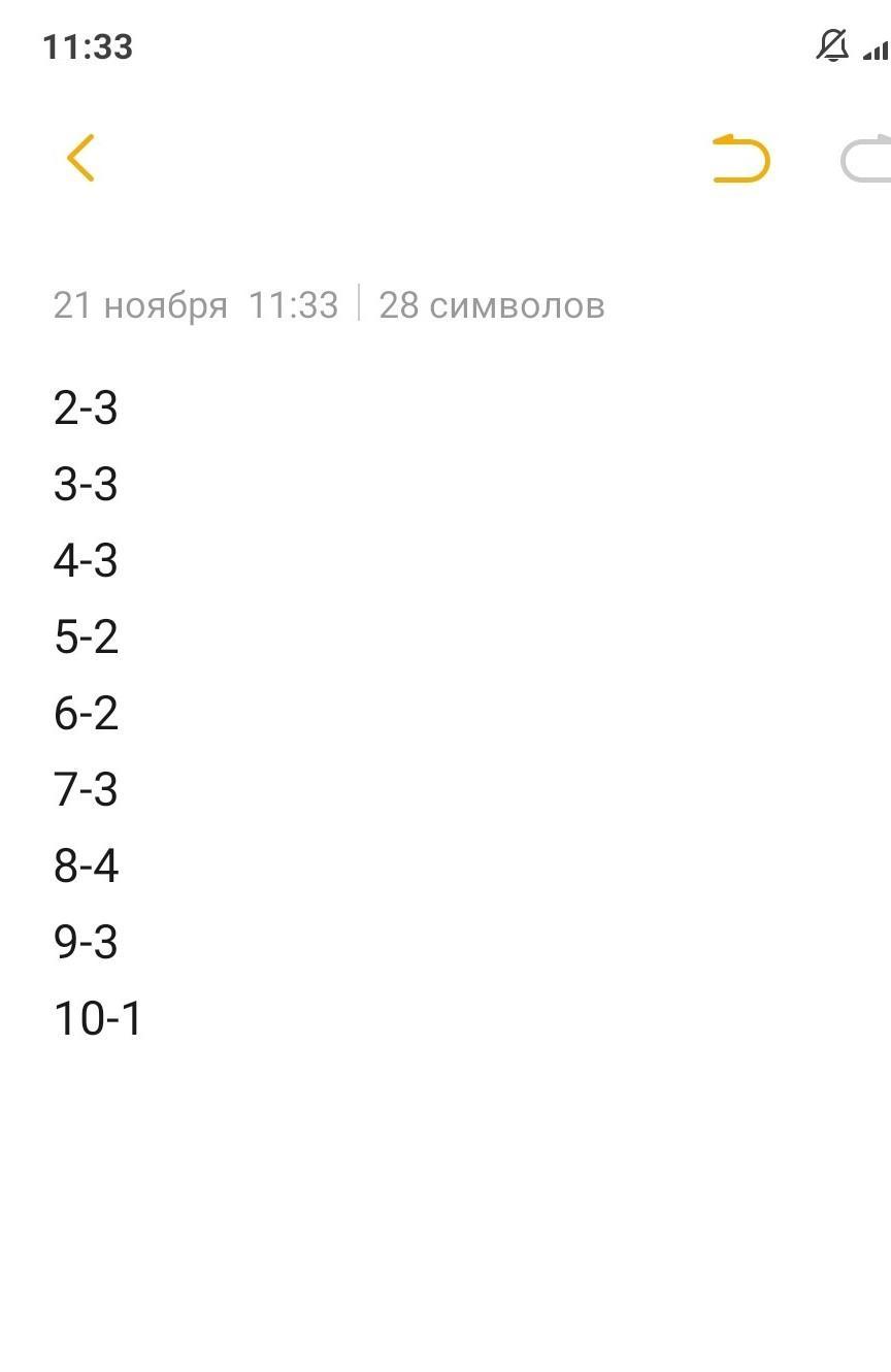 2-3, 3-3, 4-3, 5-2, 6-2, 7-3, 8-4, 9-3, 10-1