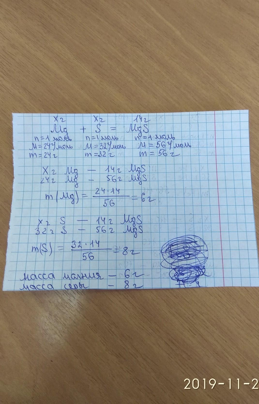 Магний соединяется с серой в массовом отношении 3:4. Вычисли массы исходных веществ, которые потребуются для получения 14 г сульфида магния.