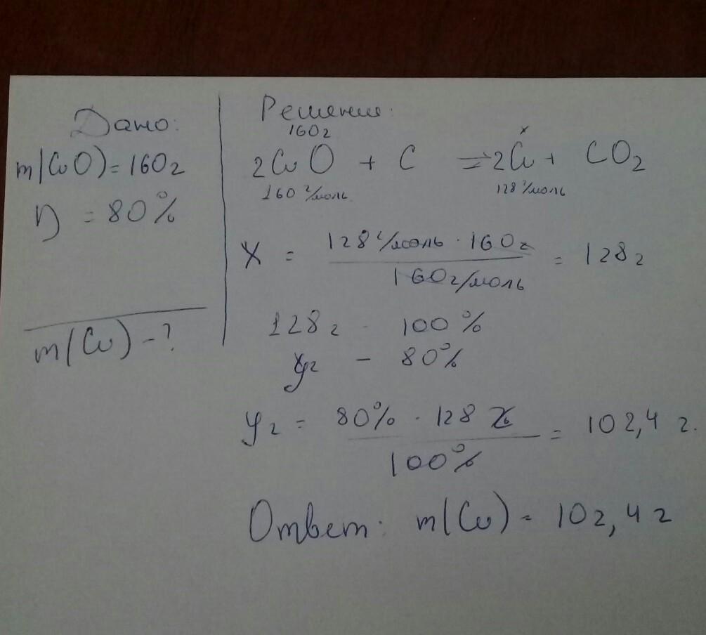 Рассчитать массу меди,которую можно получить при восстановлении углеродом 160 г. Оксид меди(2).Выход составляет 80%.