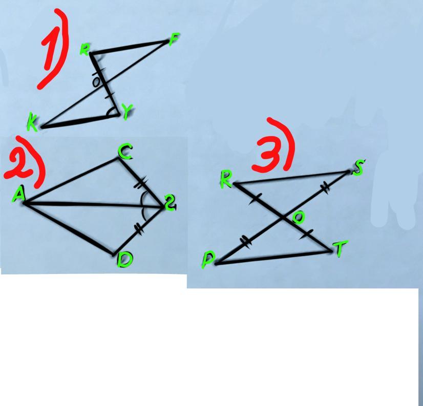 1)по 2 признаку равенства треугольников. 2)По первому признаку равенства треугольников. 3)углы вертикальные значит они равны