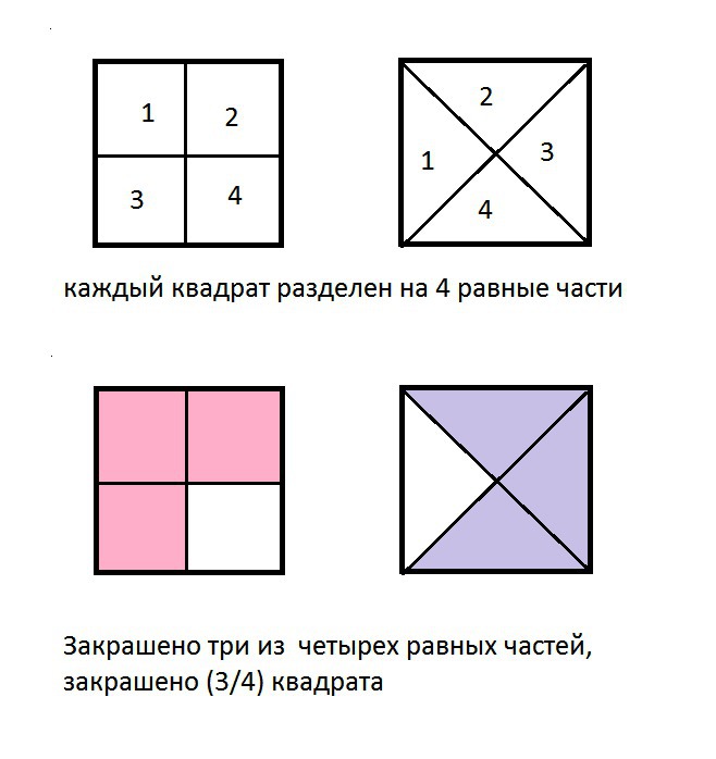 На сколько равных частей разделён каждый квадрат на чертеже?Найди площадь трех четвертых долей каждого квадрата.Сравни эти площади. (примерно такие квадраты)
