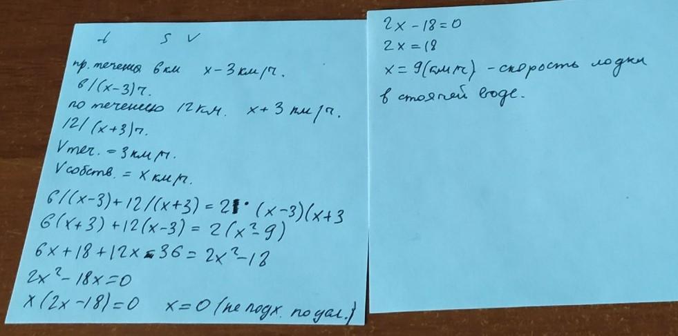 Лодка прошла 6км против течения реки и 12 км по течению, потратив на весь путь 2ч. Найдите скорость лодки в стоячей воде, если скорость течения реки составляет 3 км/ч.