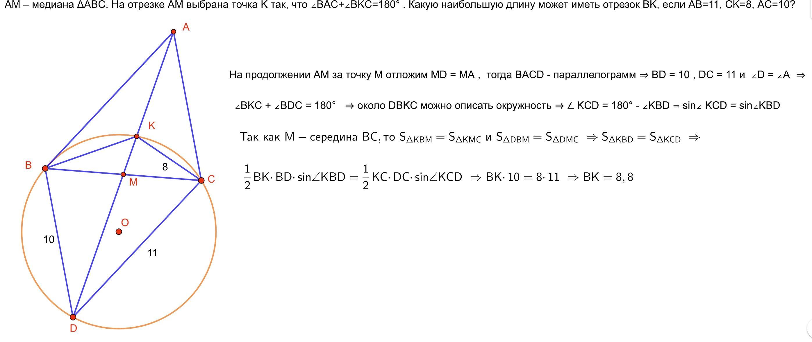 уголBAC+уголBKC=180° . Какую наибольшую длину может иметь отрезок BK, если AB=11, CK=8, AC=10?