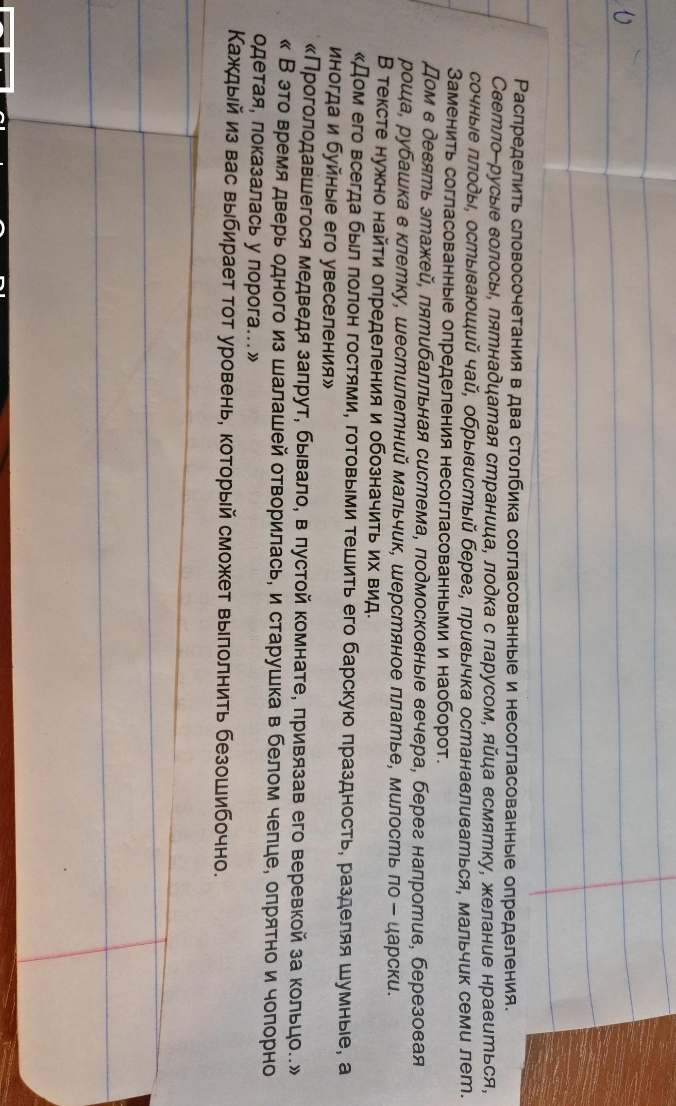 1)Соглас:светло-русые волосы, пятнадцатая страница,сочные плоды, остывающиц чай, обрывистый берег (все остальные в этом упр. несогласованные)
