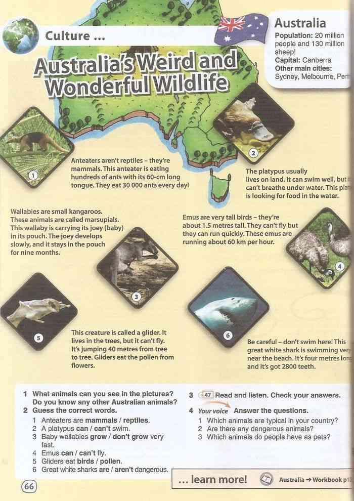 ll71% 15:57 Культура Австралії. Населення: 20 мільйонів людей і 130 мільйонів овець. Столиця: Канберра. Інші основні міста Сідней, Мельбурм, дивні і чудові дикі тварини, що перебувають у дикій природі, не є рептиліями - це ссавці. Цей мурашник їсть сотні мурашок своїм 60-сантиметровим язиком. Вони з'їдають 30 000 мурашок щодня! Платиноз звичайно живе на суші. Він може добре плавати, але не може дихати під водою. Ця плата шукає їжі у воді. Wallables - це маленькі кенгуру. Цих тварин називають сумчастими. Цей валлабі несе в сумці свою веселість (немовля). Джої розвивається повільно, і він тримається в мішечку протягом дев'яти місяців Емус - дуже високі птахи - вони близько 1,5 метра у висоту. Вони не можуть літати, але можуть швидко бігти. Ці емуси бігають близько 60 км на годину. Ця істота називається планер. Він живе на деревах, але не може літати. Це стрибки на 40 метрів з дерева на дерево. Планери їдять пилок з квітів. Будьте обережні - не купайтесь тут! Ця велика біла акула купається біля пляжу. Це чотири метри, і у нього 2800 зубів. 1 Яких тварин ви можете побачити на малюнках? Чи знаєте ви інших австралійських тварин? 2 Відгадайте правильні слова. 47 Читай і слухай. Перевірте свої відповіді 4 Ваш голос Відповідь на питання. 1 Які тварини типові у вашій країні? 2 Чи є небезпечні тварини? 3 До яких тварин належать люди як домашні тварини? 1 Антеатри - це ссавці / плазуни. 2 Платиносець може / не вміє плавати. 3 Дитячі шпалери ростуть / ростуть не дуже швидко 4 Емус вміє / не вміє літати 5 Планери їдять птахів / пилок. 6 Великі білі акули не / небезпечні ... дізнайтеся більше!