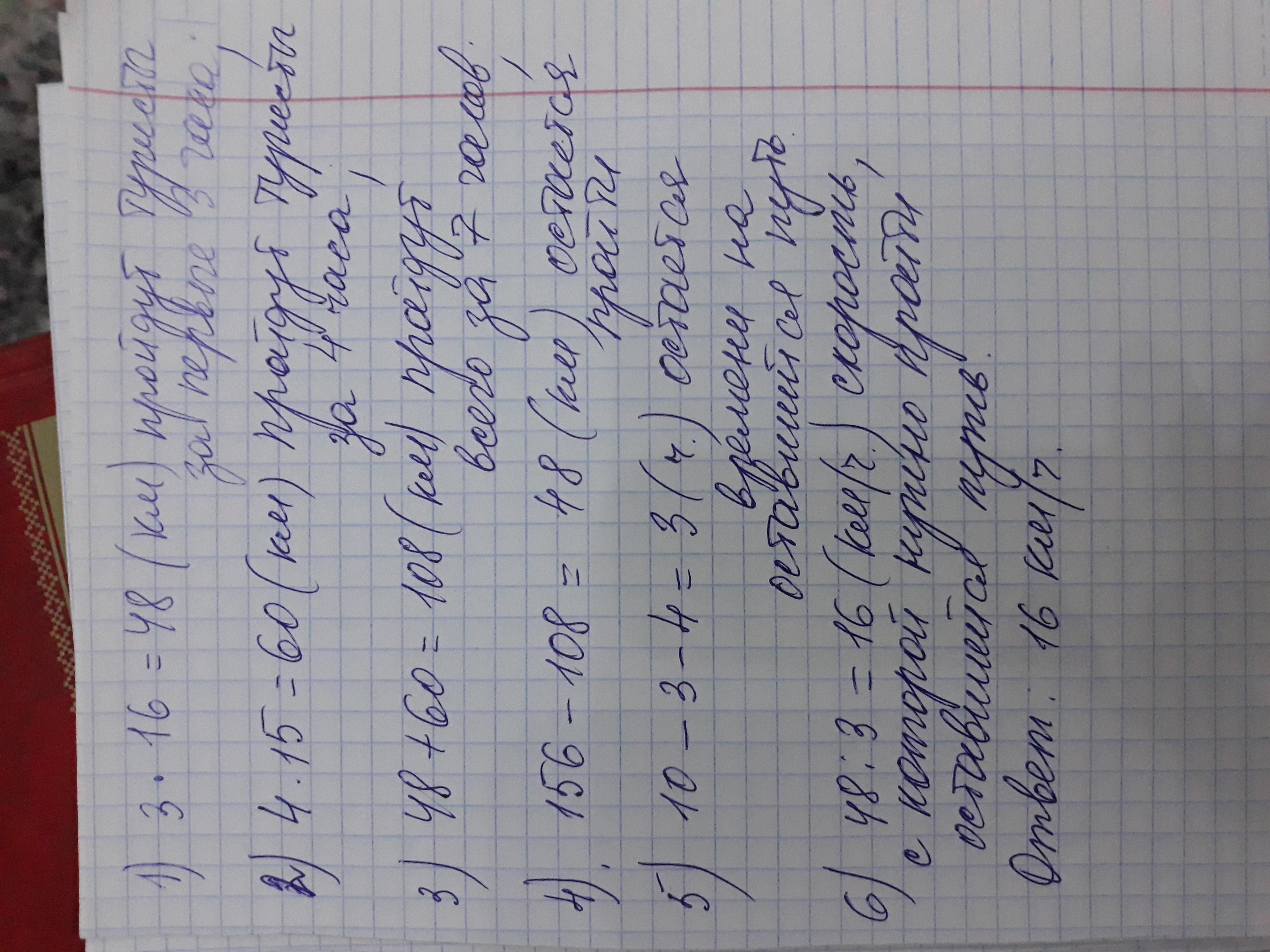 туристы собрались преодолеть путь в 156 км за 10 часов. Первые 3 часа они шли со скоростью 16км/ч следующие 4 часа со скоростью 15км/ч. С какой скоростью они должны идти в оставшееся время, чтобы уложиться в срок?
